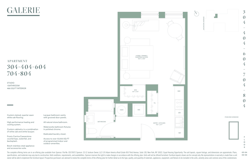 More than 13,000 square feet of additional amenities include a private off-street porte-cochere entrance leading to enclosed parking; a spacious, art-filled lobby attended 24/7; full-size indoor pool (39x13 feet) which opens to the courtyard; fitness center with state-of-the-art cardio and weight-training equipment and amble space for stretching and personal training sessions; library with books selected from the MoMA PS1 bookstore; lounge; party room; pet spa; stroller storage; and children's playroom. GALERIE will also feature secure bike storage; full-time live-in resident manager; an expansive landscaped rooftop replete with grilling stations, dining areas, and comfortable seating against a postcard-view backdrop of the Manhattan skyline. Rooftop cabanas will be available for purchase.