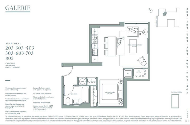 Thoughtfully appointed and spacious alcove studio. Providing a bonus room ready for a sleeping alcove or home office, three full closets including a walk-in and a welcoming open kitchen and living area, there is space to grow. The interior design of the residence is seamlessly modern, with the clean lines of the custom oak flooring and a neutral palette that nevertheless contains a variety of sophisticated details. GALERIE offers distinct living experiences that feature three unique architectural glazing styles- punched windows, window walls, and curtain walls. The workmanship is superior, with materials and finishes that are modern and sublime. Airy and open, the interiors anticipate owners who appreciate a space that can be easily decorated to reflect their personal point-of-view. Seamlessly integrated with the living space, high design and precision woodwork express the quality of the kitchens. Sophisticated matte white oak millwork is complemented with bright white lacquer cabinets. A suite of stainless steel Bosch appliances and LED lighting completes the package. The master bath is an artistic sanctuary with custom lacquer cabinetry and distinctive Zebra-Mink marble wall tiles and accents. All bathrooms include polished Waterworks fixtures.