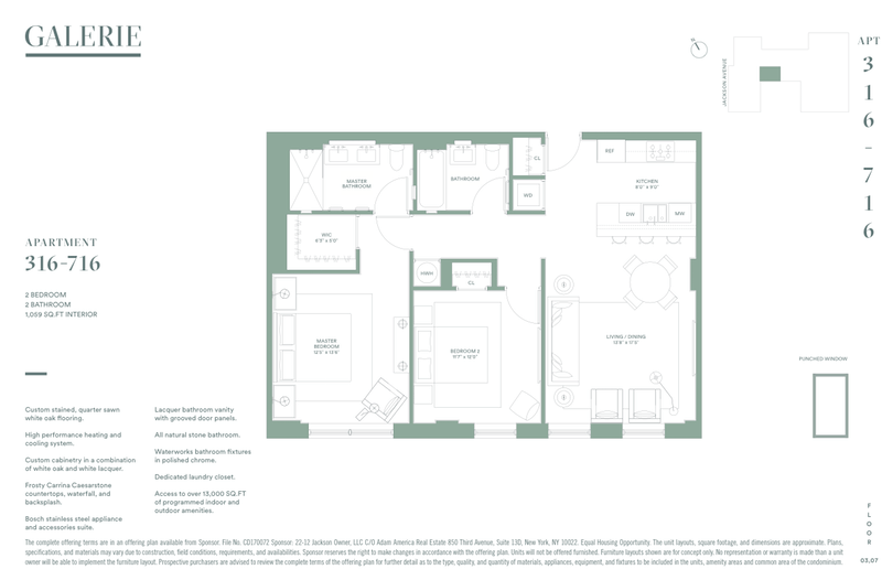 This welcoming home delivers two spacious bedrooms including a master suite with walk-in closet and spa-like master bath. Six windows frame the sunny southwestern view to the curated courtyard. The interior design of the residence is seamlessly modern, with the clean lines of the custom oak flooring and a neutral palette that nevertheless contains a variety of sophisticated details. GALERIE offers distinct living experiences that feature three unique architectural glazing styles- punched windows, window walls, and curtain walls. The workmanship is superior, with materials and finishes that are modern and sublime. Airy and open, the interiors anticipate owners who appreciate a space that can be easily decorated to reflect their personal point-of-view. A selection of residences also include private outdoor space. Seamlessly integrated with the living space, high design and precision woodwork express the quality of the kitchens. The dining island features a Caesarstone countertop and waterfall edge detail. Sophisticated matte white oak millwork is complemented with bright white lacquer cabinets. A suite of stainless steel Bosch appliances and LED lighting completes the package. The master bath is an artistic sanctuary with custom dual-sink lacquer cabinetry and distinctive Zebra-Mink marble wall tiles and accents. Glazed ceramic tiled walls with Maku Light in a herringbone pattern make the secondary bath an unexpected luxury. All bathrooms include polished Waterworks fixtures.