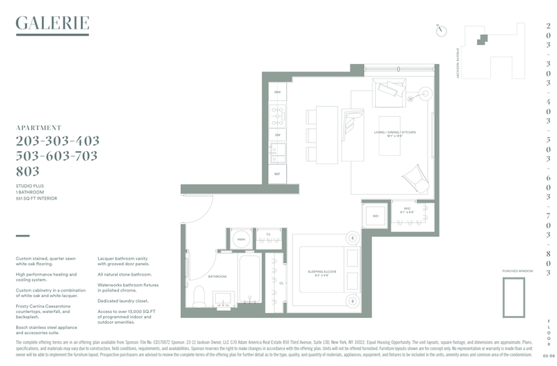 More than 13,000 square feet of additional amenities include a private off-street porte-cochere entrance leading to enclosed parking; a spacious, art-filled lobby attended 24/7; full-size indoor pool (39x13 feet) which opens to the courtyard; fitness center with state-of-the-art cardio and weight-training equipment and amble space for stretching and personal training sessions; library with books selected from the MoMA PS1 bookstore; lounge; party room; pet spa; stroller storage; and children's playroom. GALERIE will also feature secure bike storage; full-time live-in resident manager; an expansive landscaped rooftop replete with grilling stations, dining areas, and comfortable seating against a postcard-view backdrop of the Manhattan skyline. Rooftop cabanas will be available for purchase.