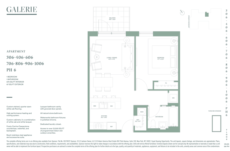 More than 13,000 square feet of additional amenities include a private off-street porte-cochere entrance leading to enclosed parking; a spacious, art-filled lobby attended 24/7; full-size indoor pool (39x13 feet) which opens to the courtyard; fitness center with state-of-the-art cardio and weight-training equipment and amble space for stretching and personal training sessions; library with books selected from the MoMA PS1 bookstore; lounge; party room; pet spa; stroller storage; and children's playroom. GALERIE will also feature secure bike storage; full-time live-in resident manager; an expansive landscaped rooftop replete with grilling stations, dining areas, and comfortable seating against a postcard-view backdrop of the Manhattan skyline. Rooftop cabanas will be available for purchase.
