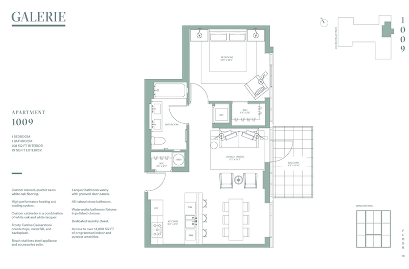 Looking out from the 10th floor of GALERIE, this well-appointed one bedroom, one bath home is thoughtfully planned. The southern exposures in the generous living room afford the space abundant light through floor to ceiling window walls and the balcony off the space is perfect to enjoy your morning coffee. The master suite is graciously appointed with a walk-in closet and spa-like master bath. The interior design of this expansive residence is seamlessly modern, with the clean lines of the custom oak flooring and a neutral palette that nevertheless contains a variety of sophisticated details. The workmanship is superior, with materials and finishes that are modern and sublime. Airy and open, the interiors anticipate owners who appreciate a space that can be easily decorated to reflect their personal point-of-view. Seamlessly integrated with the living space, high design and precision woodwork express the quality of the kitchens. The dining island features a Caesarstone countertop and waterfall edge detail. Sophisticated matte white oak millwork is complemented with bright white lacquer cabinets. A suite of stainless steel Bosch appliances and LED lighting completes the package. The master bath is an artistic sanctuary with custom dual-sink lacquer cabinetry and distinctive Zebra-Mink marble wall tiles and accents and polished Waterworks fixtures.
