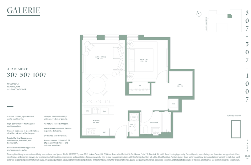 More than 13,000 square feet of additional amenities include a private off-street porte-cochere entrance leading to enclosed parking; a spacious, art-filled lobby attended 24/7; full-size indoor pool (39x13 feet) which opens to the courtyard; fitness center with state-of-the-art cardio and weight-training equipment and amble space for stretching and personal training sessions; library with books selected from the MoMA PS1 bookstore; lounge; party room; pet spa; stroller storage; and children's playroom. GALERIE will also feature secure bike storage; full-time live-in resident manager; an expansive landscaped rooftop replete with grilling stations, dining areas, and comfortable seating against a postcard-view backdrop of the Manhattan skyline. Rooftop cabanas will be available for purchase.